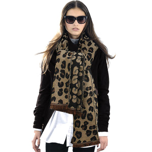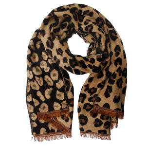 Camel Leopard Print Reversible Cozy Scarf Featuring Fringe Edging. 90 Acrylic & 10% Polyester. Other side has reverse coloring